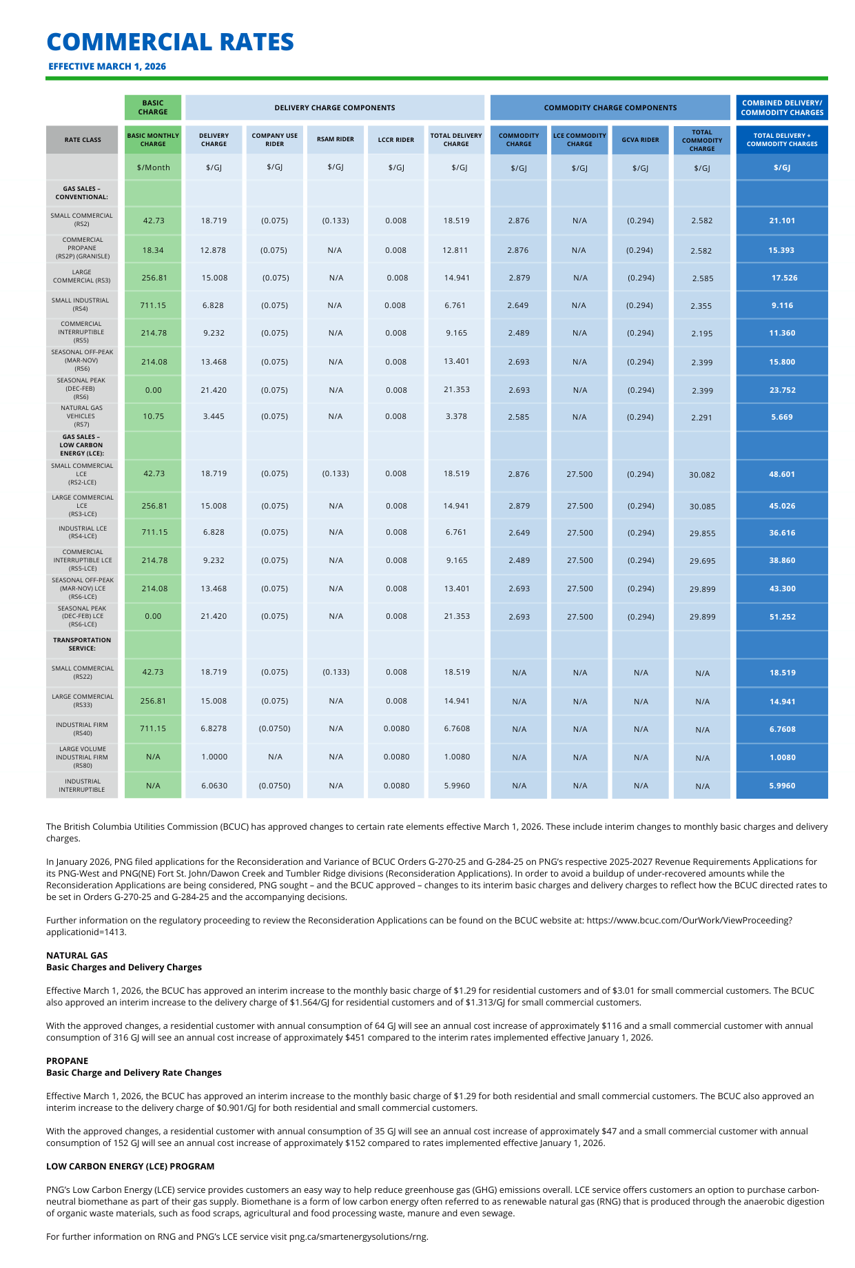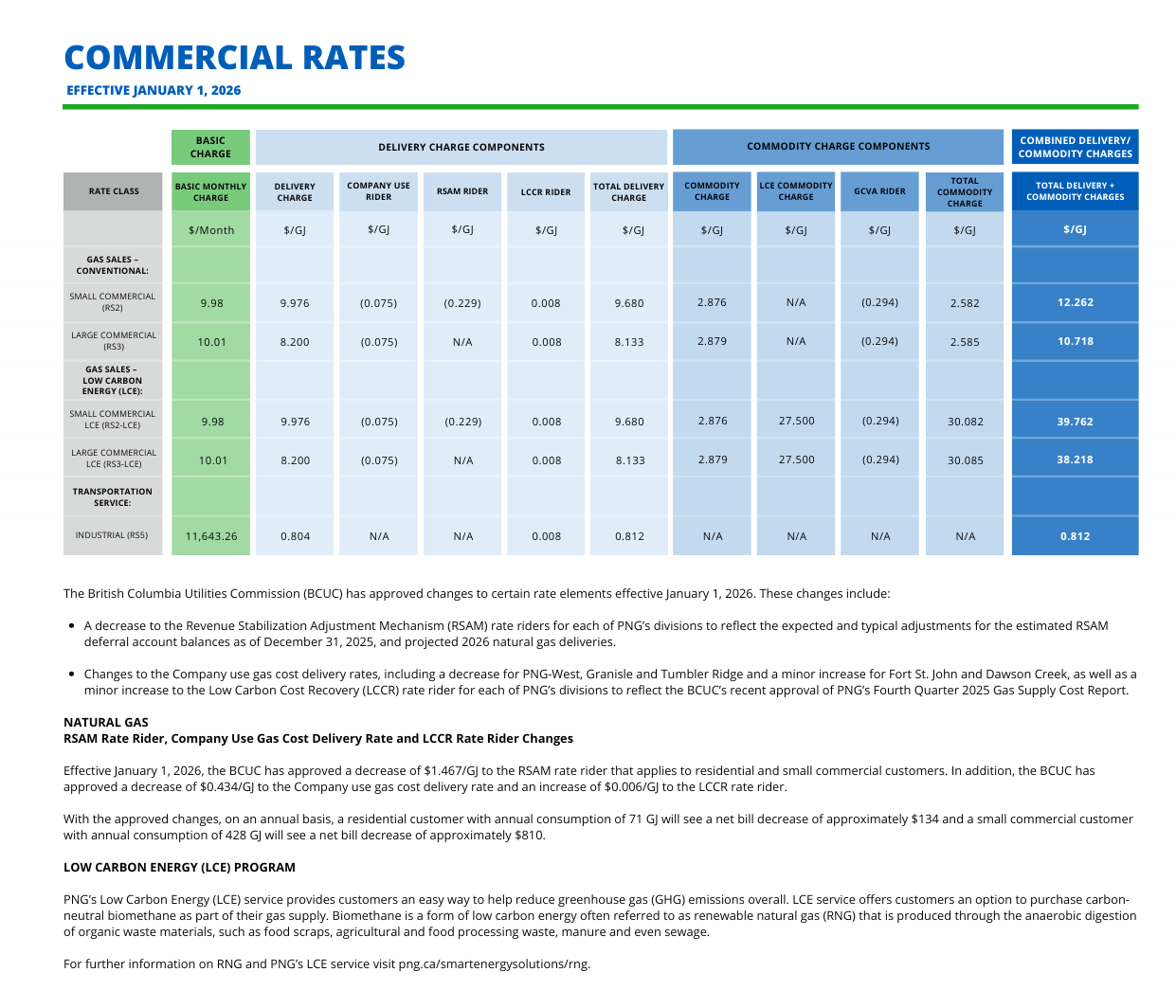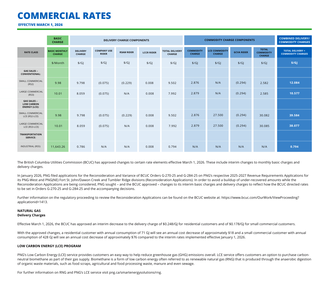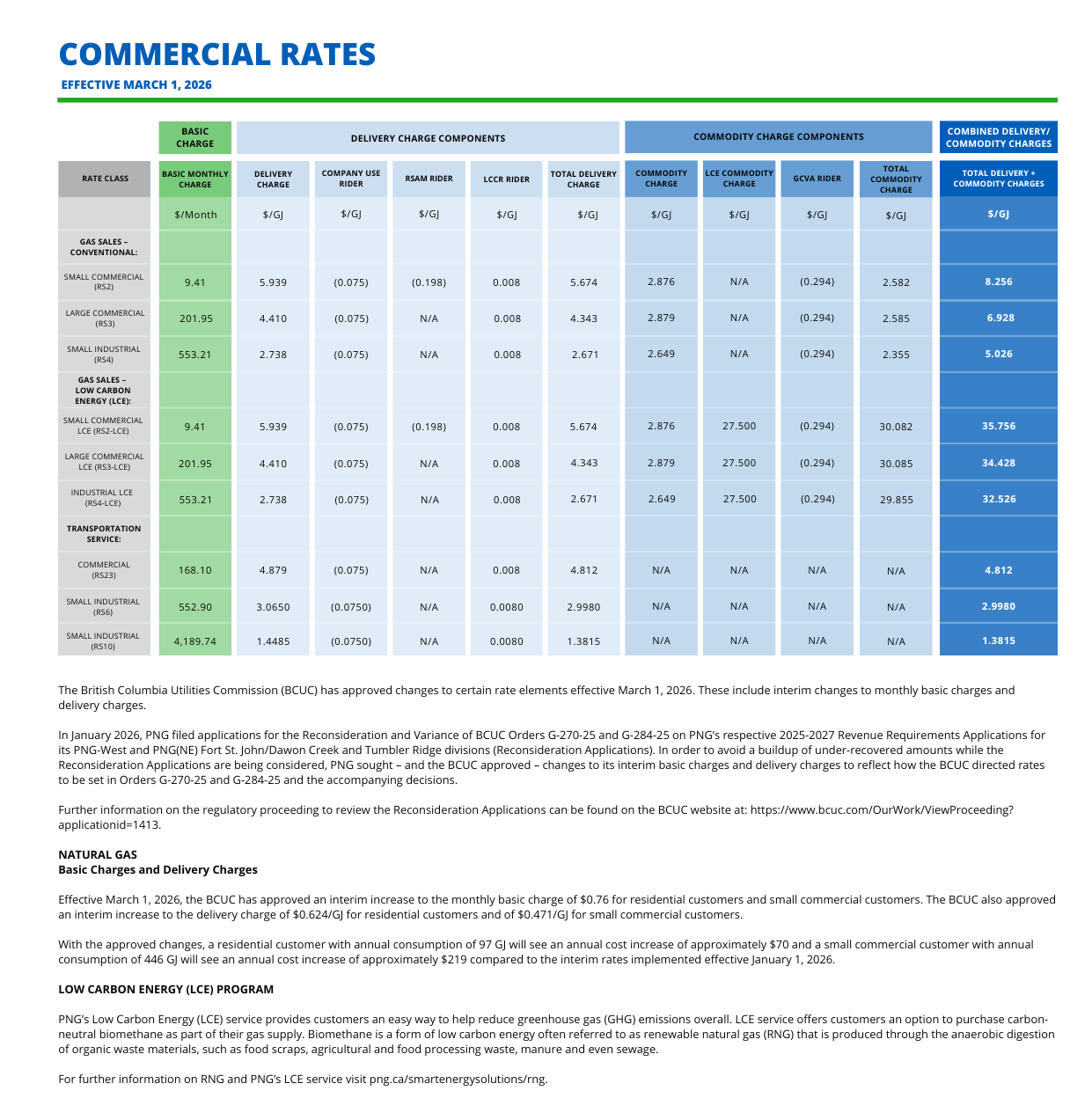 Your business natural gas bill includes a fixed monthly charge, as well as delivery and commodity charges applied to each gigajoule (GJ) of natural gas consumed.We pass the cost of the gas (commodity cost) on to you without mark up – so you pay what we pay. Any rate changes proposed by PNG are subject to review and approval by the British Columbia Utilities Commission (BCUC).