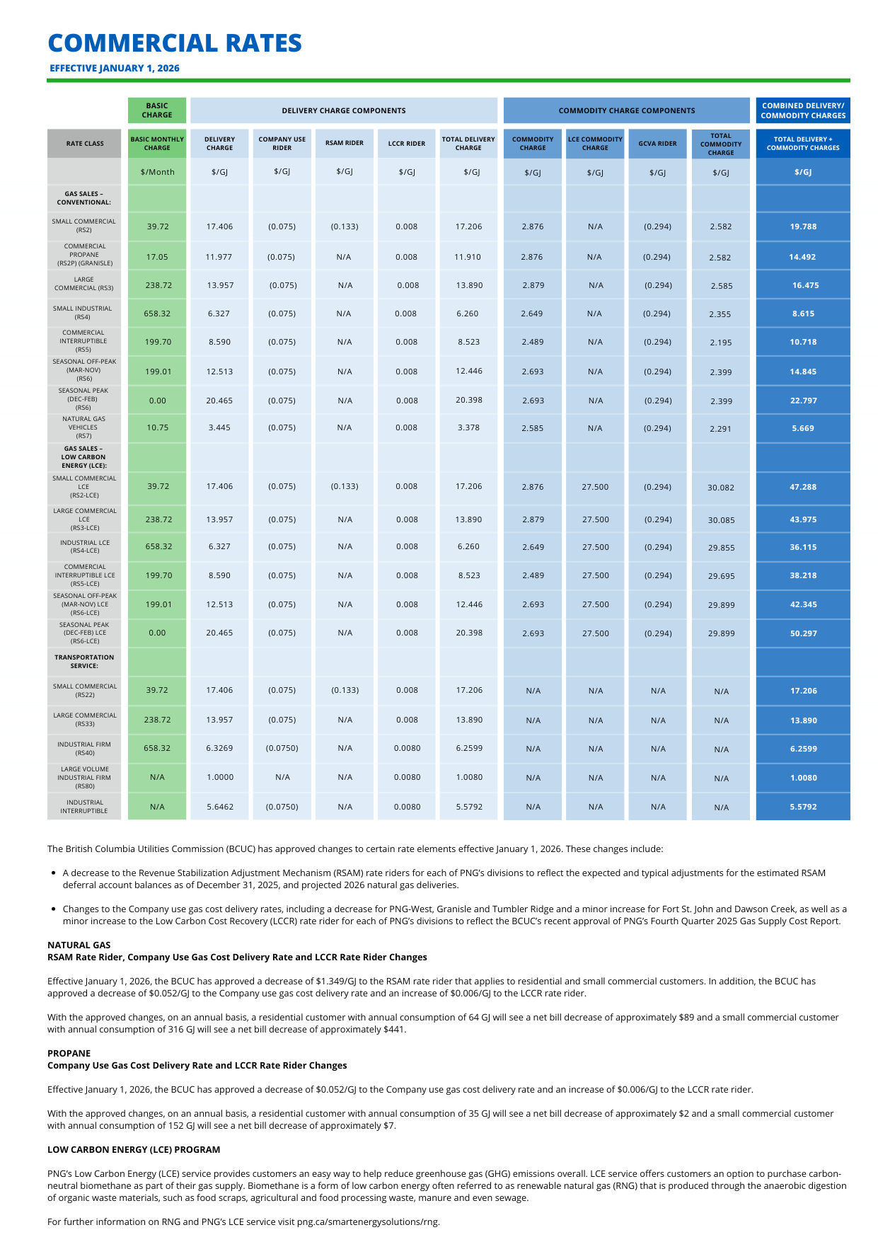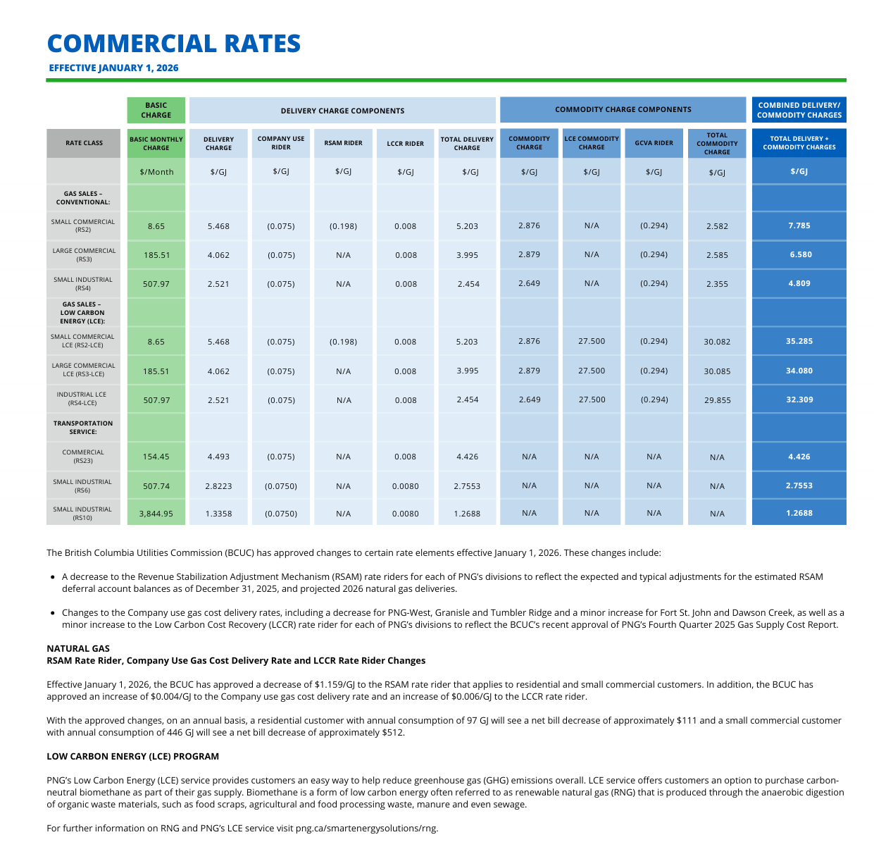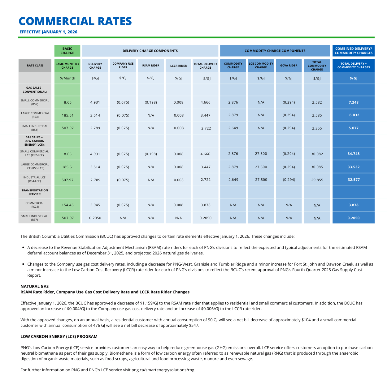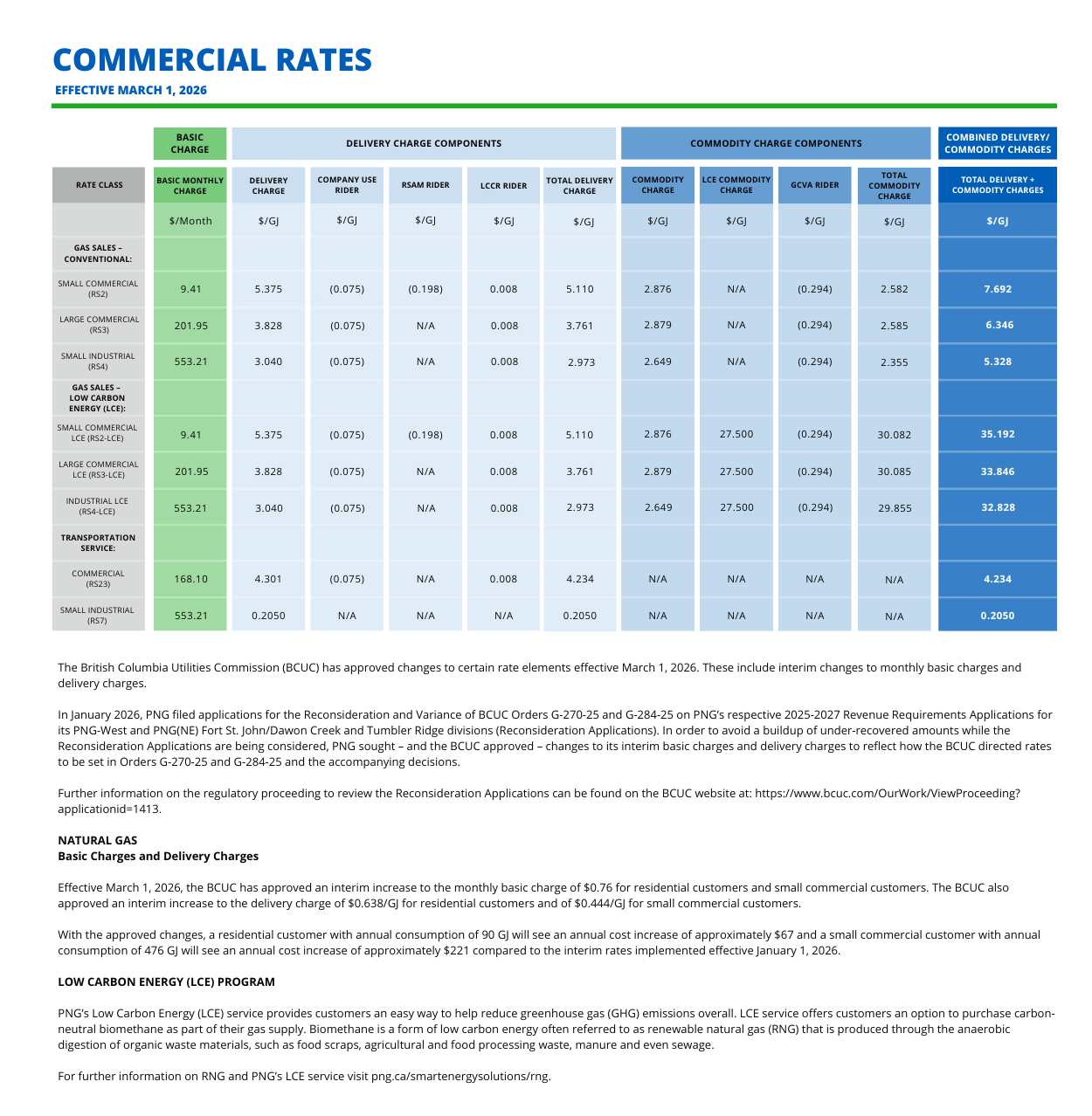 Your business natural gas bill includes a fixed monthly charge, as well as delivery and commodity charges applied to each gigajoule (GJ) of natural gas consumed.We pass the cost of the gas (commodity cost) on to you without mark up – so you pay what we pay. Any rate changes proposed by PNG are subject to review and approval by the British Columbia Utilities Commission (BCUC).