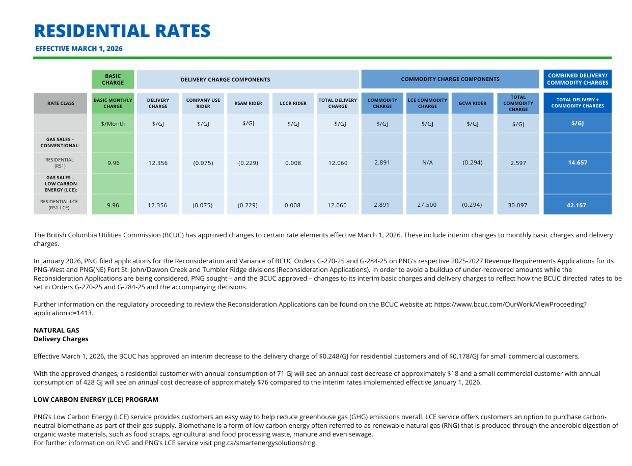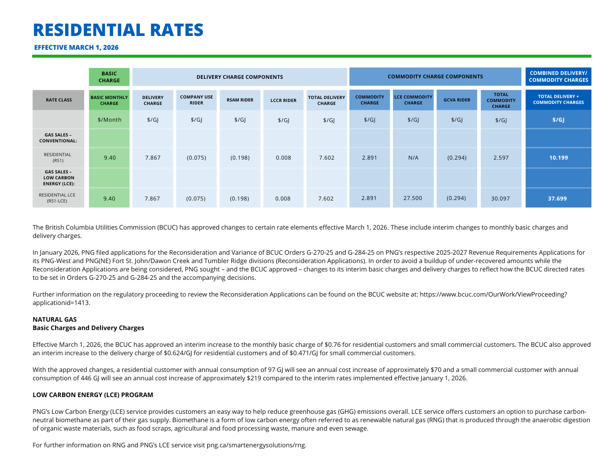 Your residential natural gas bill includes a fixed monthly charge, as well as delivery and commodity charges applied to each gigajoule (GJ) of natural gas consumed. We pass the cost of the gas (commodity cost) on to you without mark up – so you pay what we pay. Any rate changes proposed by PNG are subject to review and approval by the British Columbia Utilities Commission (BCUC).